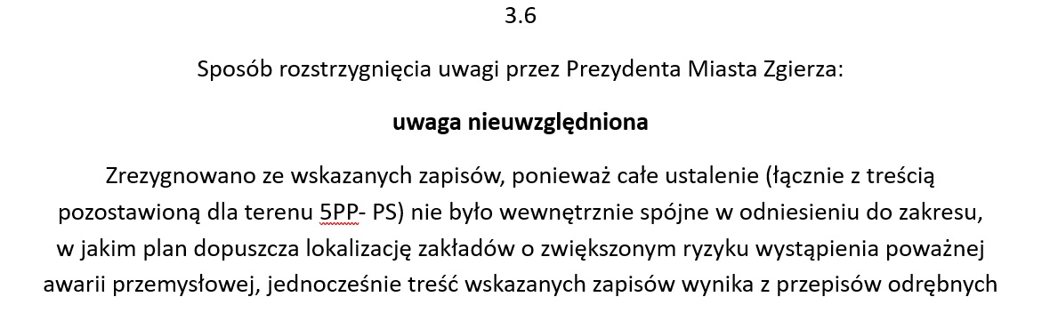 Uwaga 3.6 - W §31 pkt 6) lit. c) dotyczącym terenu 5PP-PS projektu zmiany planu przywrócenie zapisów §20 ust. 5 pkt 2) lit. a i lit. b) dotychczasowego planu: ,,a) obowiązuje jego zaprojektowanie, wykonanie, prowadzenie oraz likwidacja w sposób zapobiegający awariom przemysłowym i ograniczający ich skutki dla ludzi oraz środowiska, b) obowiązuje zastosowanie rozwiązań wykluczających powstanie skutków wobec osób oraz szkód w mieniu poza terenem, do którego inwestor posiada tytuł prawny".