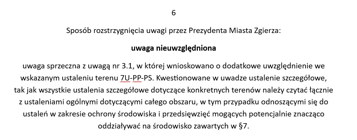 Uwaga 3.1 - Zmiana treści §29 pkt 6 lit. a rozdziału 12 projektu zmiany planu na „ na terenie oznaczonym symbolem 4U-PP-PS i 7U- PP-PS dopuszcza się przedsięwzięcia mogące potencjalnie znacząco oddziaływać na środowisko".